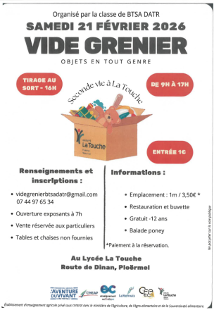 Le tarif est fixé à 3,50 € le mètre linéaire et le vide-grenier se déroulera dans la salle omnisports du lycée.