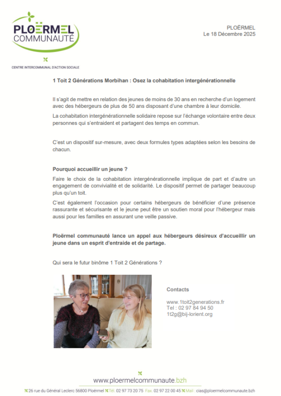 1 Toit 2 Générations Morbihan Accueil Actualités 1 Toit 2 Générations Morbihan 1 Toit 2 Générations Morbihan : Osez la cohabitation intergénérationnelle.Qui sera le futur binôme 1 Toit 2 Générations ? Retour aux actualités
