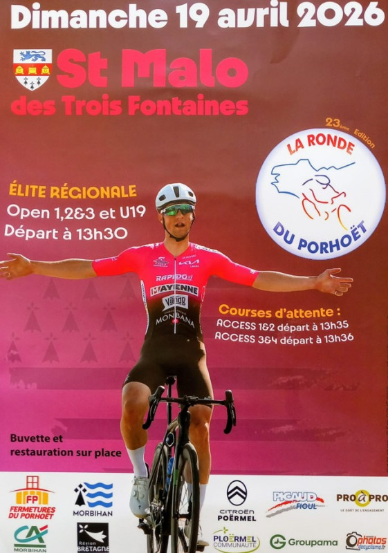 Cyclisme - La Ronde du Porhoët Accueil Actualités Cyclisme - La Ronde du Porhoët 🚴🚴Courses Cyclistes 🚴🚴La Ronde du Porhoët 🗓️Dimanche 19 avril 2026📍à St Malo des Trois Fontaines🕜️Départ à 13h30 Retour aux actualités