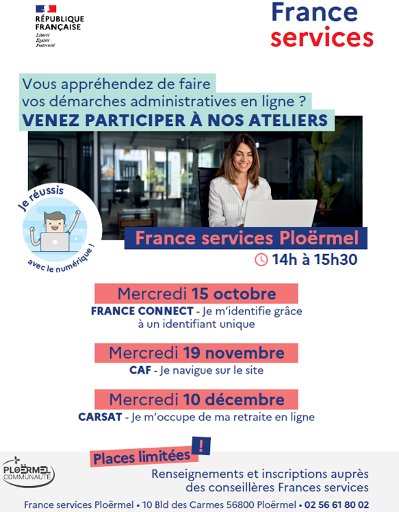 Les France services de Ploërmel Communauté (Ploërmel, Mauron, Josselin, la Trinité-Porhoët et le bus itinérant ICI PLO.Com) proposent un accompagnement personnalisé, confidentiel et gratuit sur de nombreuses démarches administratives et numériques de la vie quotidienne (famille, retraite, emploi, santé, impôts, mobilité, justice…).