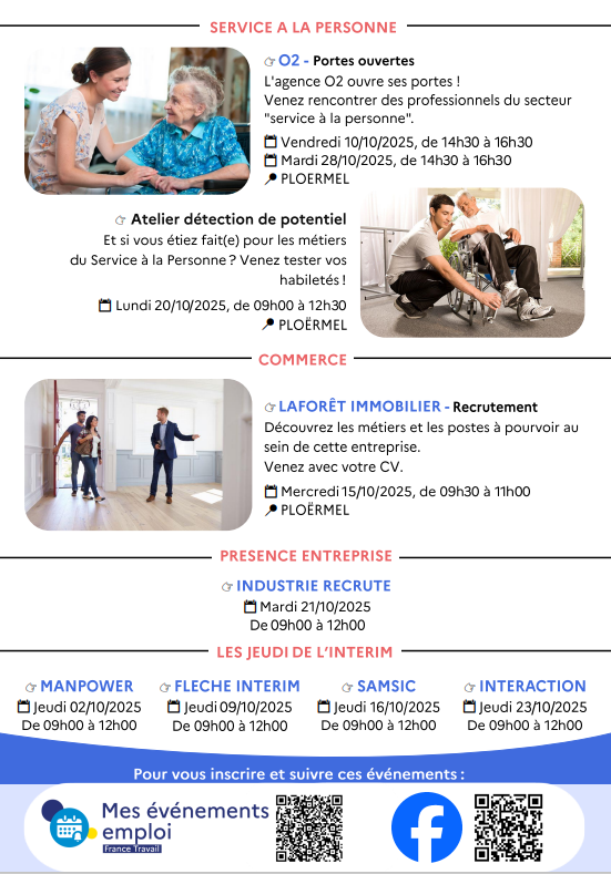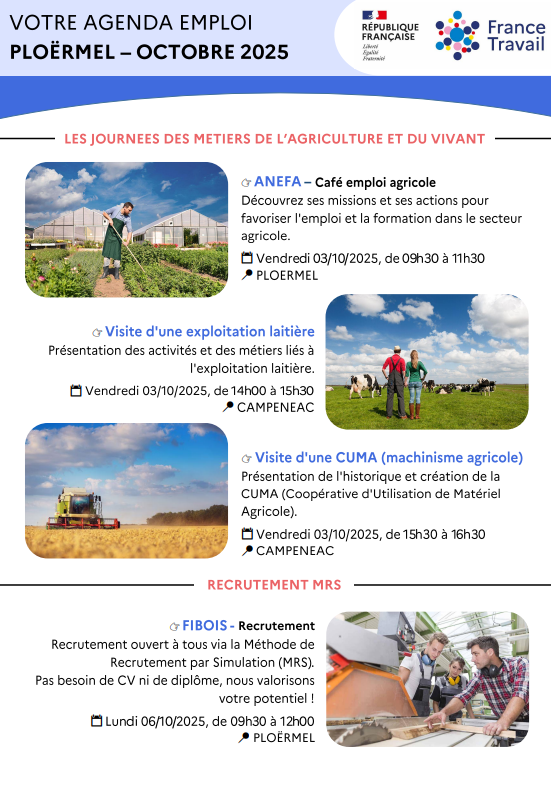 France Travail - votre agenda d'octobre 2025 📅 Accueil Actualités France Travail - votre agenda d'octobre 2025 📅 Les journées des métiers de l'agriculture et du vivantDécouvrez le programme du mois d'octobre de France Travail Retour aux actualités