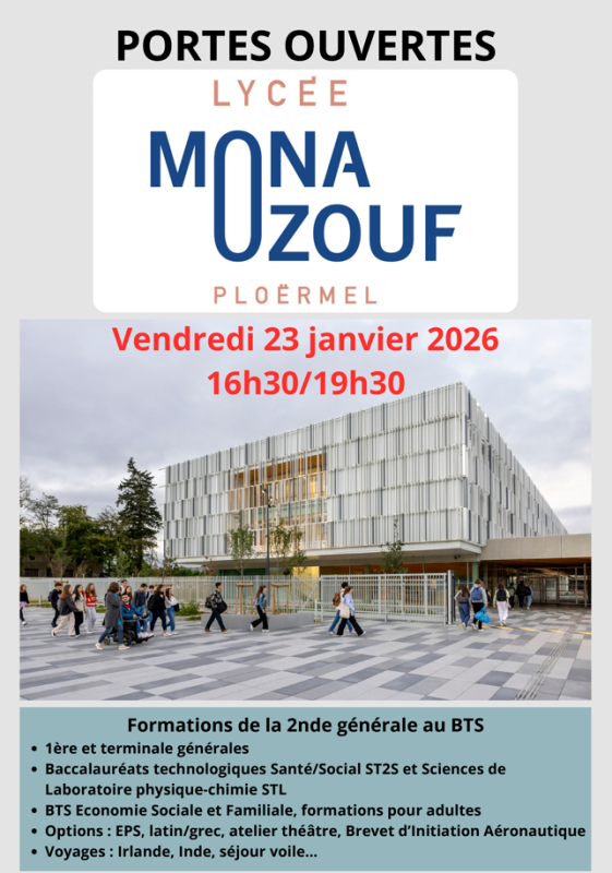 Portes ouvertes Lycée Mona Ozouf Accueil Actualités Portes ouvertes Lycée Mona Ozouf Les portes ouvertes du lycée Mona Ozoufauront lieu🗓️le vendredi 23 janvierde 16h30 à 19h30. Retour aux actualités