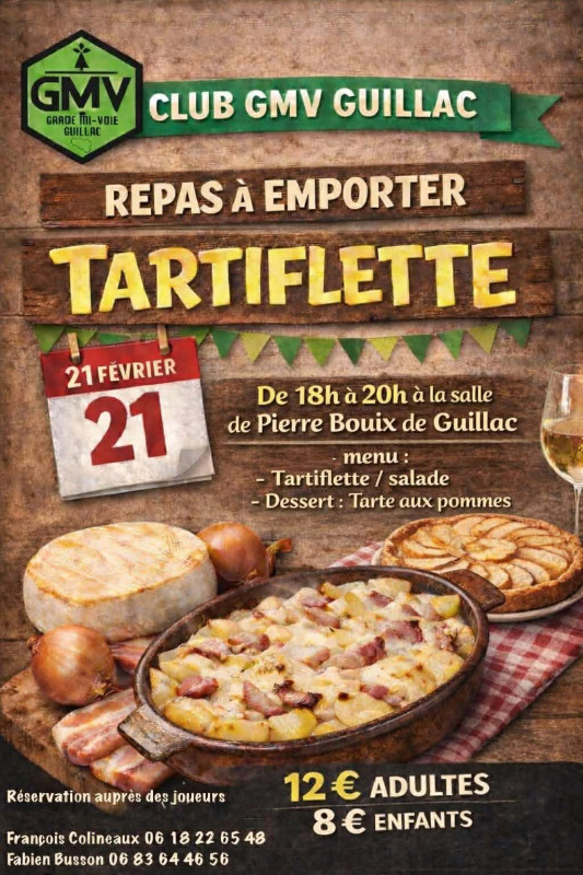 Repas à emporter - Tartiflette GMV 🍽️ Accueil Actualités Repas à emporter - Tartiflette GMV 🍽️ Le club GMV vous propose une tartiflette à emporter. 🗓️21 février 2026🕕️de 18H à 20H📍Salle de Pierre Bouix - GuillacTarif : 12€ pour les adultes8€ pour les enfants Réservation auprès des joueurs Retour aux actualités