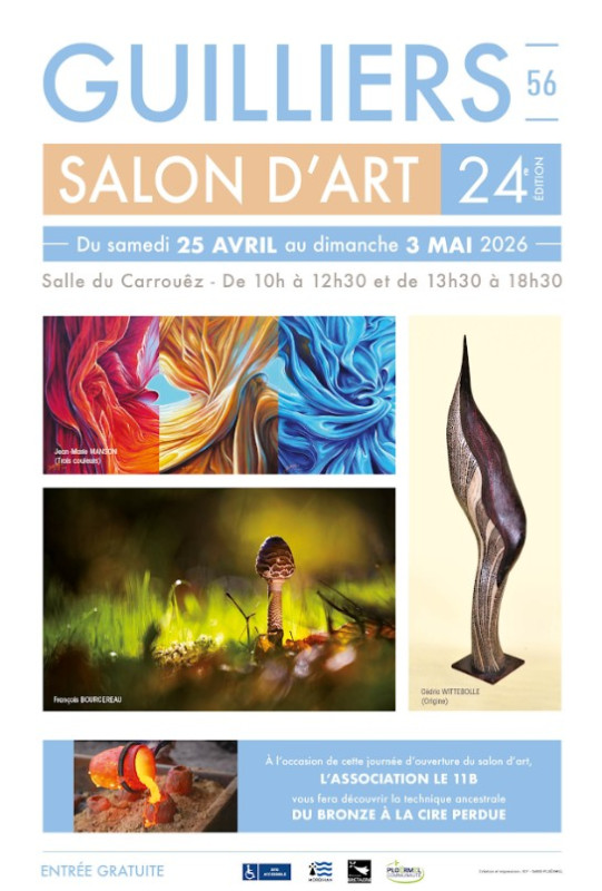 🎨 Salon d’art à Guilliers Accueil Actualités 🎨 Salon d’art à Guilliers Venez découvrir la 24ème édition du salon d'art à Guilliers. 📅 Du 25 avril au 3 mai📍Salle du Carrouez🕙️de 10h à 12h30 puis de 13h30 à 18h30 Entrée gratuite 🥂Vernissage le samedi 25 avril à 18h Retour aux actualités