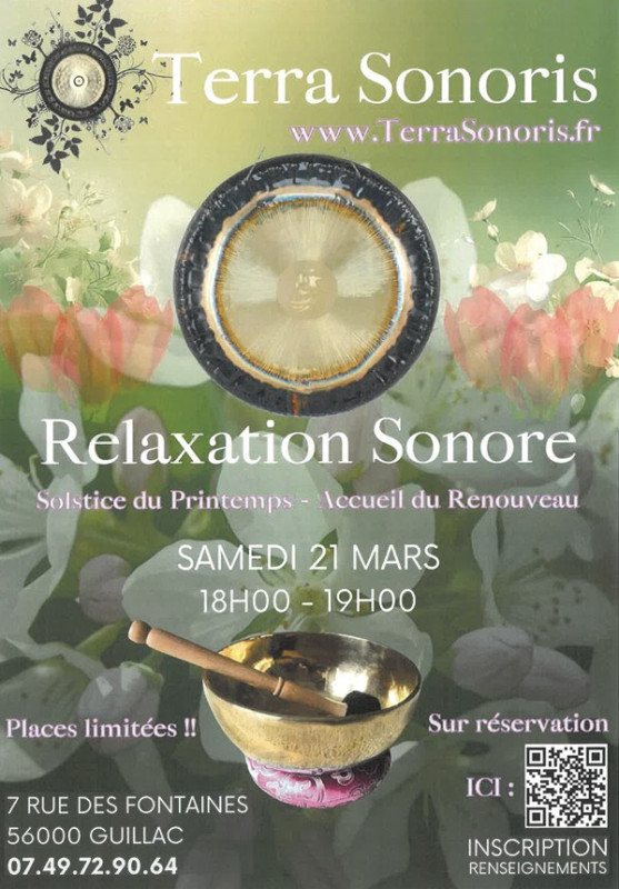 Terra Sonoris - Relaxation Sonore 🧘 Accueil Actualités Terra Sonoris - Relaxation Sonore 🧘 🗓️samedi 21 mars🕧️de 18h à 19h📍7 rue des Fontaines 56800 GUILLACSur réservation au 07 49 72 90 64 ou en flashant le qr-code ci-jointwww.terrasonoris.fr Retour aux actualités