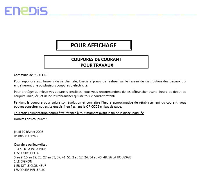 Des travaux sur le réseau électrique auront lieu le Jeudi 19 février 2026 entraînant une coupure de courant.